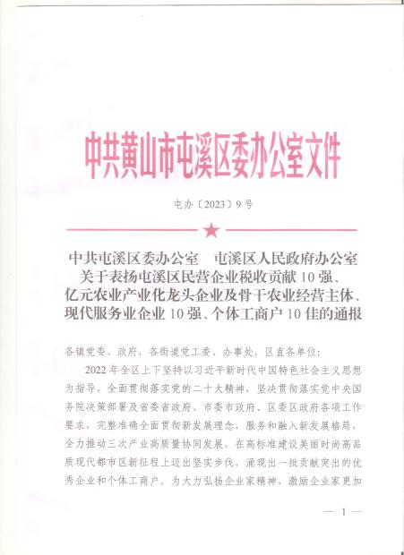 文章詳情2023年2月1日中共黃山市區(qū)委區(qū)政府公布了《關(guān)于表揚(yáng)屯溪區(qū)民營企業(yè)稅收貢獻(xiàn)10強(qiáng)、億元農(nóng)業(yè)產(chǎn)業(yè)化龍頭企業(yè)及骨干農(nóng)業(yè)經(jīng)營主體、現(xiàn)代代服務(wù)業(yè)企業(yè)10強(qiáng)、個(gè)體工商戶10佳的通報(bào)》(屯辦[2003]9號),我公司榮獲屯溪區(qū)民營企業(yè)稅收貢獻(xiàn)10強(qiáng)之一。
